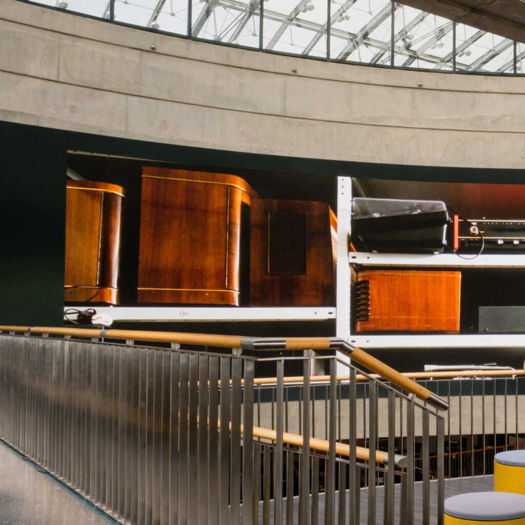 A visit to Haus der Geschichte begins in the foyer with a view of the curved wall opposite the entrance. In May 2024, a 13.6 x 4.8 meter LED wall was installed above the museum café area on the second floor showing pictures of exhibits, dates for new special exhibitions, a photo collage on 75 years of the German Constitution. The large-sized content gives an impression of how multifaceted history is. „The LED wall gives us great new opportunities to visually address our visitors with a wide variety of content,“ says Dr. Ruth Rosenberger, representative of Digital Services at the Haus der Geschichte Foundation.